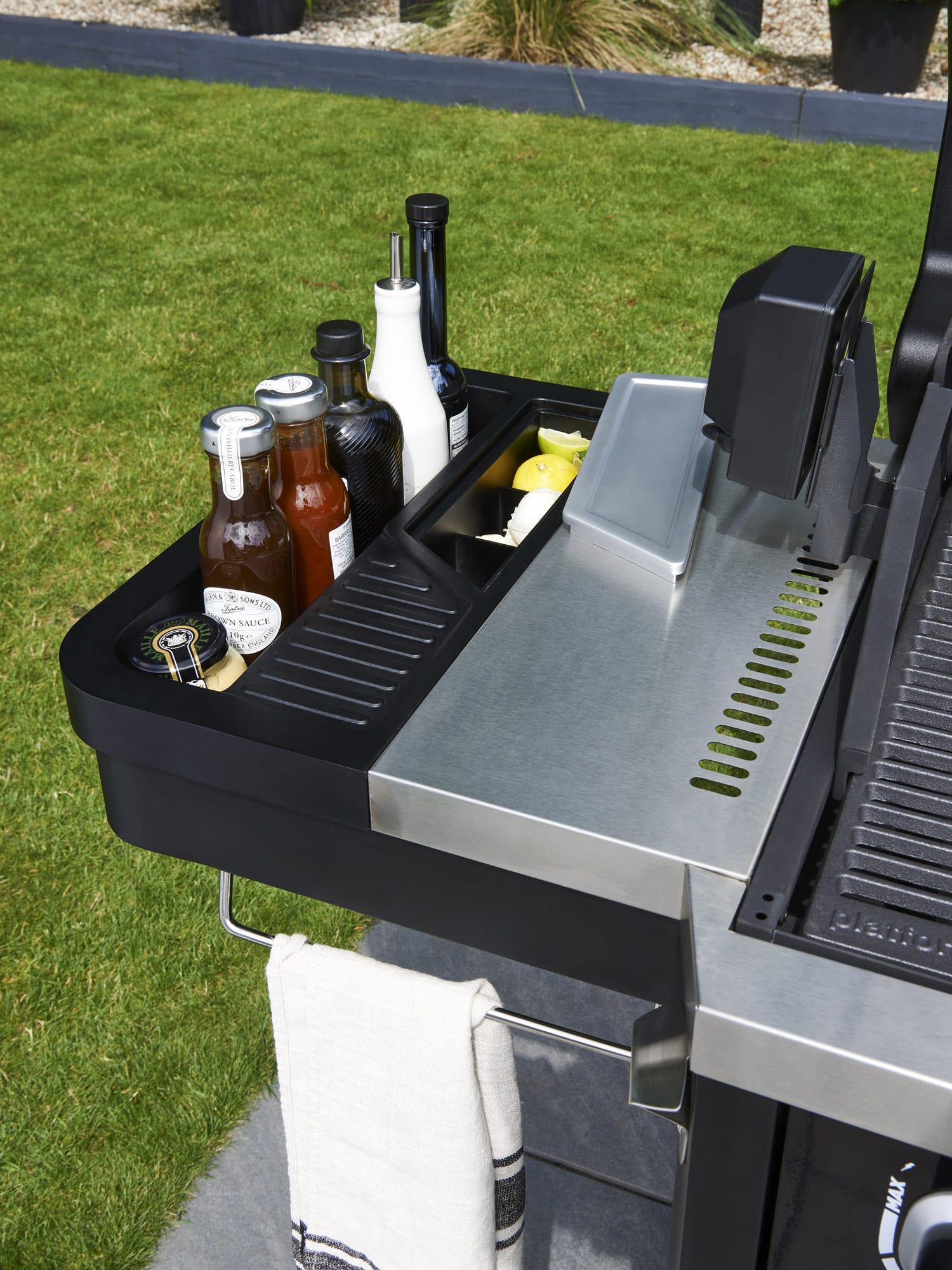 - Tool holder to keep your grilling accessories close by, safe, and clean
